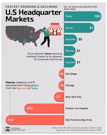 These headline shifts sit atop a larger wave: from 2018–2023, CBRE tracked 465 major HQ relocations nationwide with about half going to Texas³ and from 2018–2024, Greater Los Angeles lost 106 and the Bay Area lost 156 headquarters.⁴